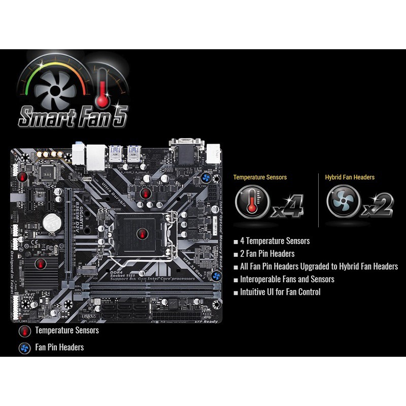 Các chân cắm 4pin trên GIGABYTE B365M D2V có khả năng hỗ trợ toàn bộ các linh kiện tản nhiệt như quạt, bơm, thậm chí là cảm biến dòng chảy trong các bộ tản nhiệt nước, giúp người dùng thoải mái thiết lập hệ thống tản nhiệt cho máy tính của mình.