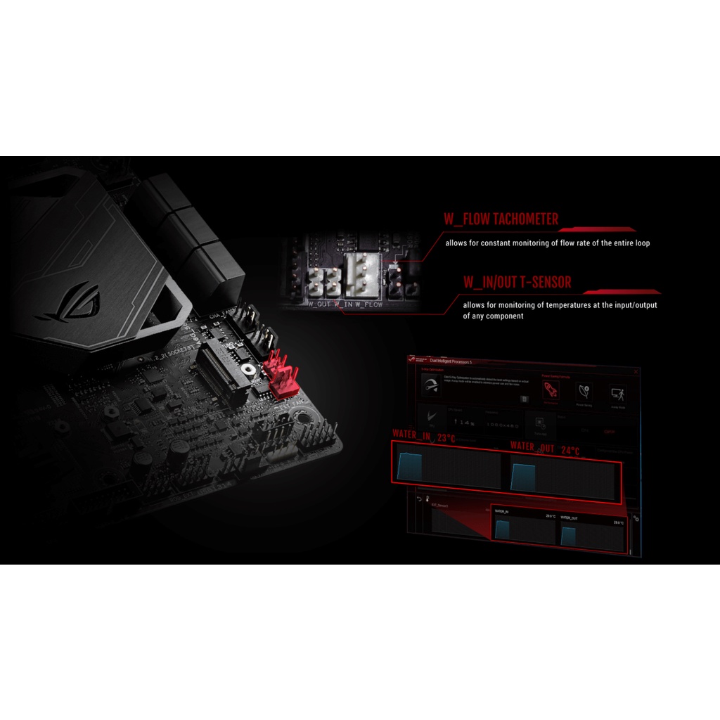 Vùng làm mát bằng nước cải tiến của ROG cho phép bạn giám sát hệ thống làm mát của mình hơn bao giờ hết. Các tiêu đề nhiệt độ nước kép của ROG Water-Cooling Zone và thông tin nguồn cấp dữ liệu của tiêu đề tốc độ dòng chảy được đưa thẳng vào tiện ích Fan Xpert 4 trực quan của ROG ─ để bạn có thể luôn được giải nhiệt và luôn mát mẻ trong mọi trò chơi!
