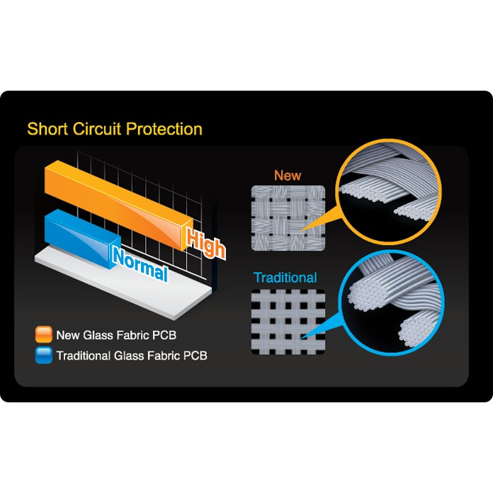 Không có gì có hại đến tuổi thọ máy tính của bạn hơn độ ẩm, và hầu hết các độ ẩm trong không khí như độ ẩm tại một số điểm trong năm. Bo mạch chủ GIGABYTE đã được thiết kế để đảm bảo rằng độ ẩm không bao giờ là vấn đề, kết hợp công nghệ Glass Fabric PCB mới làm giảm độ ẩm do điều kiện ẩm ướt. Công nghệ vải bằng thủy tinh sử dụng vật liệu PCB mới làm giảm khoảng cách giữa sợi dệt, làm cho khó xâm nhập hơn so với các bo mạch chủ PCB truyền thống. Điều này giúp bảo vệ tốt hơn rất nhiều so với sự cố mạch và hệ thống do điều kiện ẩm ướt và ẩm ướt.