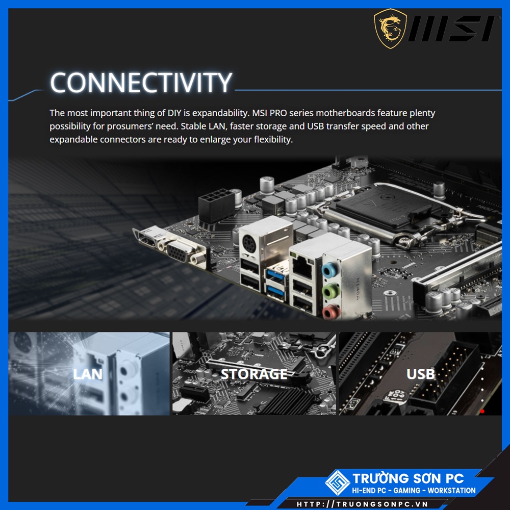 - Điều quan trọng nhất của DIY là khả năng mở rộng. Dòng bo mạch chủ MSI PRO có nhiều khả năng đáp ứng nhu cầu của người tiêu dùng. Mạng LAN ổn định, tốc độ lưu trữ và truyền USB nhanh hơn và các đầu nối có thể mở rộng khác đã sẵn sàng để tăng tính linh hoạt của bạn.