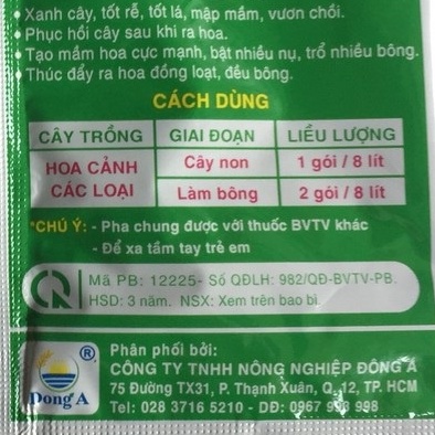 Hoa cảnh các loại: cây non 1 gói/ 8 lí nước, làm bông 2 gói / 8 lít nước.