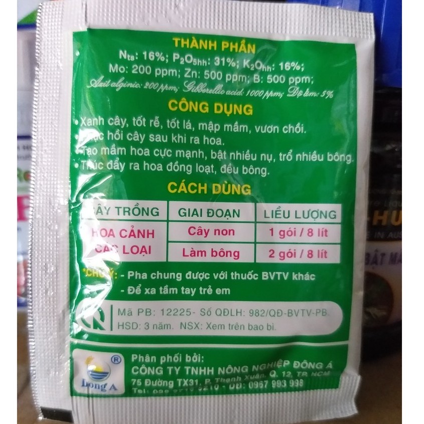 Thành Phần: N: 16%, P2O5: 31%, K2O: 16%, Mo: 200ppm, Zn: 500ppm, B: 500ppm, Axit Alginic: 200ppm, Gibberellic acid: 100ppm.