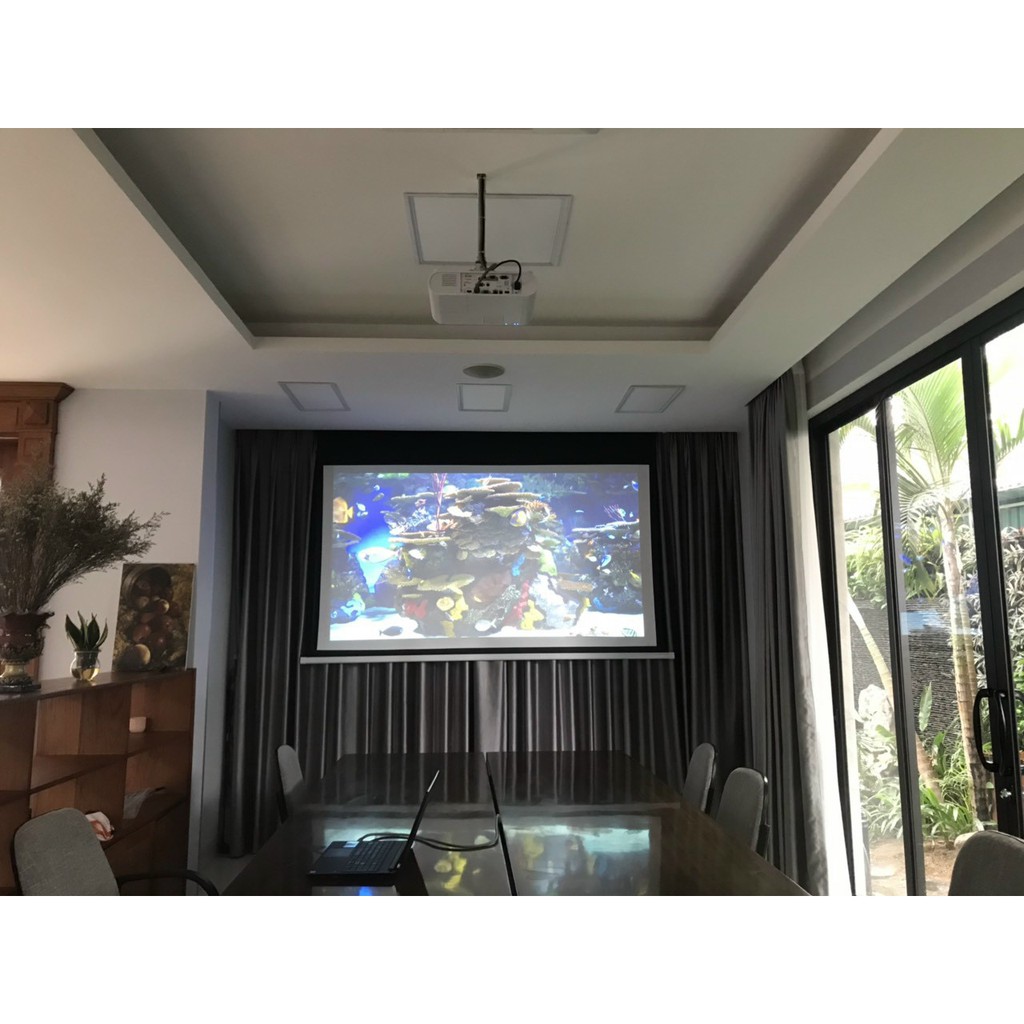 - Loại màn: Điều khiển từ xa bằng sóng RF, tiện lợi điều chỉnh hơn các màn chiếu 3 chân hoặc màn chiếu treo tường kéo tay trong buổi thuyết trình