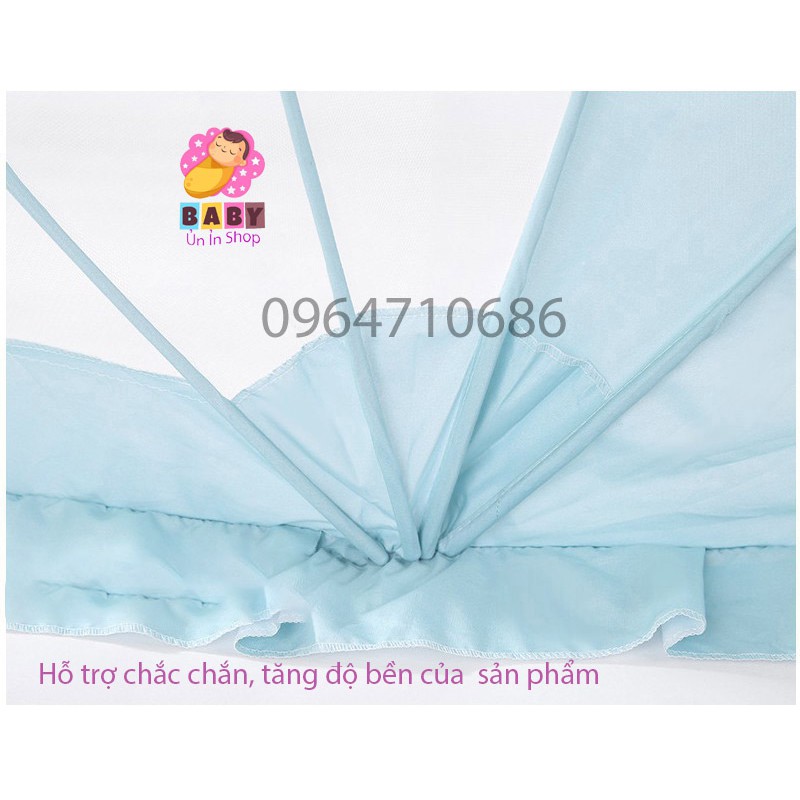 - Đóng mở chỉ bằng một thao tác, rất tiện và nhanh trong việc chăm sóc bé . Chân màn được may đường ren xinh xắn, khéo kéo giúp tránh những loại côn trùng không thể chui vào trong màn.