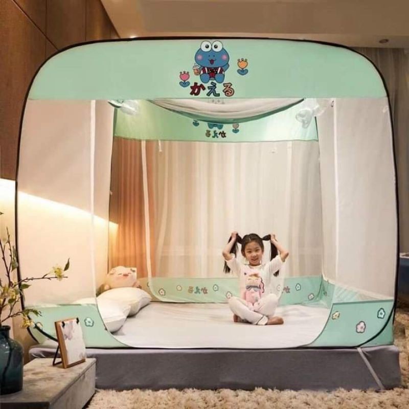 – Khung viền còn được bao bọc một lớp vải xanh, hoặc hồng dùng để cố định khung với vải tạo nên độ chắc chắn của chiếc màn đỉnh rộng tự bung này.