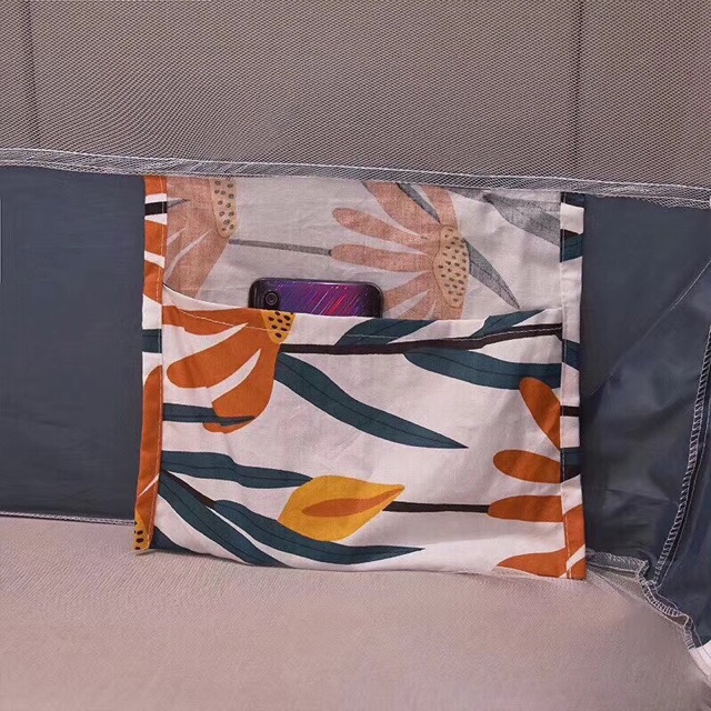 + Đáy màn được may cẩn thận, chần kỹ, sắc cạnh. Kết hợp với 4 góc chun cài vào nệm và khung thép vững chắc, giúp bảo vệ em bé không bị lăn khỏi giường giúp mẹ yên tâm để bé nằm ngủ một mình.
