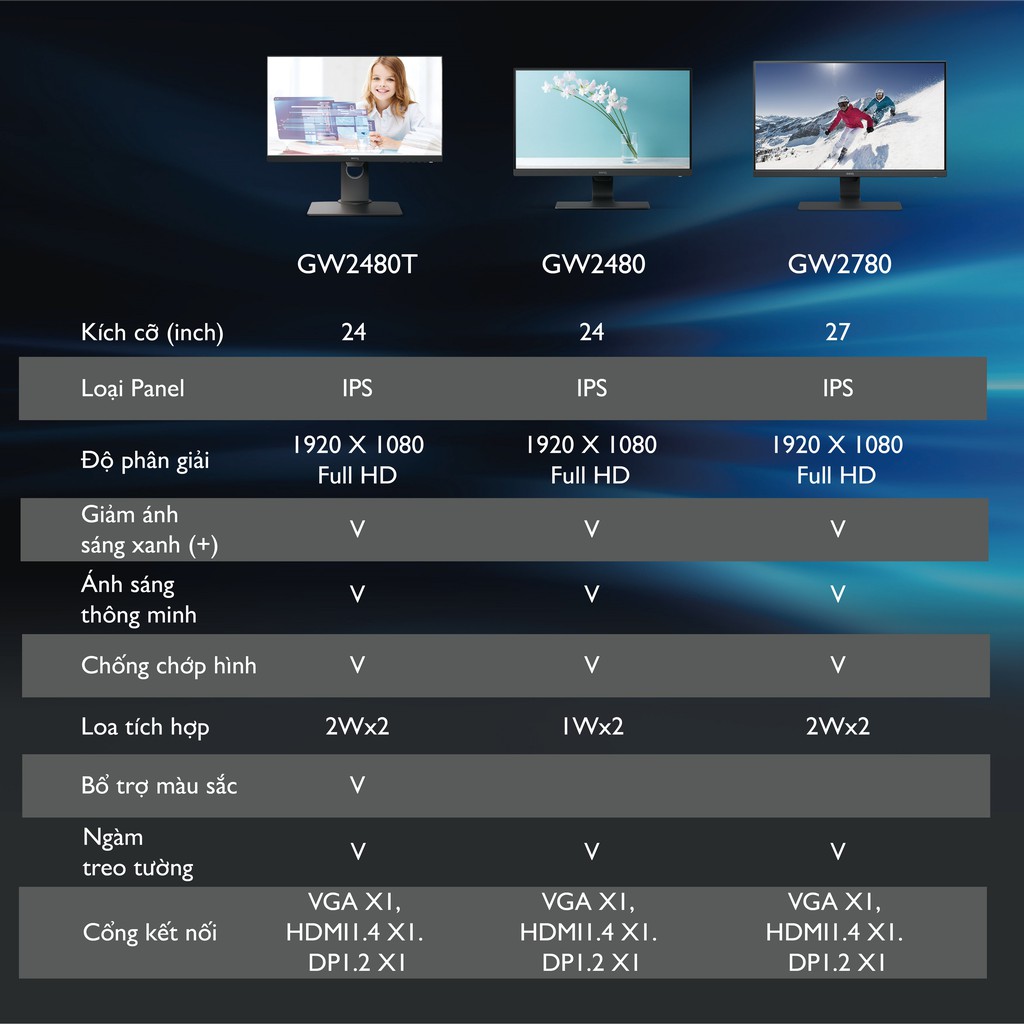 🔹 Với sự kết hợp giữa LED và Công nghệ IPS, màn hình GW2780 đạt tới tầm cao mới trong việc tái hiện chân thực các màu sắc, hiển thị màu đen có chiều sâu hơn, độ tương phản cao và chi tiết sắc nét hơn.