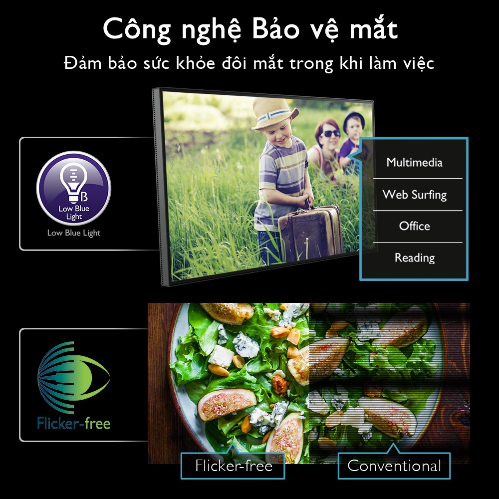 ● Tính năng bảo vệ mắt: Công nghệ giảm ánh sáng xanh, chống nhấp nháy