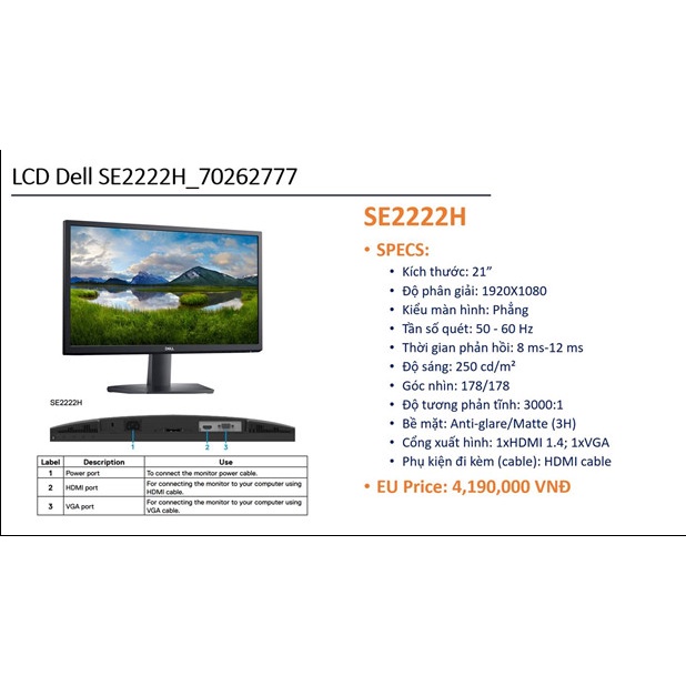 LCD DELL SE2222H là dòng sản phẩm màn hình máy tính phổ thông của hãng màn hình nổi tiếng thế giới Dell. Với thiết kế đơn giản, tinh tế, phù hợp với nhu cầu sử dụng để làm việc và học tập một cách rất phù hợp.
