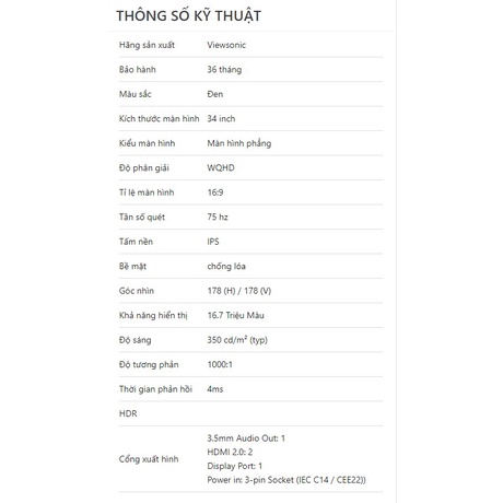 Máy tính & Laptop > Màn Hình || [Mã ELHASALE1TR giảm 5% đơn 3TR] Màn hình Viewsonic VA3456-MHDJ/ 34 inch WQHD IPS/ 75 Hz/ 3 Yrs - Hàng chính hãngCòn hàng