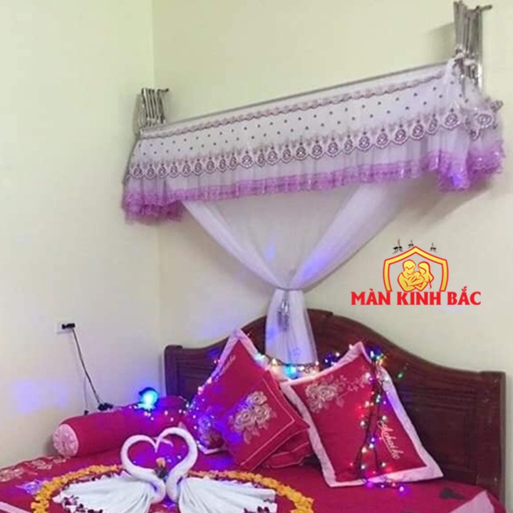 Bên cạnh sự chuẩn bị chăn ga gối đệm cho ngày trọng đại, màn khung trở thành vật không thể thiếu khi bạn chuẩn bị cho giường cưới. Lựa chọn bộ màn khung trang trí cho gường cưới cũng cần phải đặt những vấn đề như :chọn màu màn cho hợp với màu sơn .hợp với màu ga gối...Màn khung xếp gọn phối ren kiểu