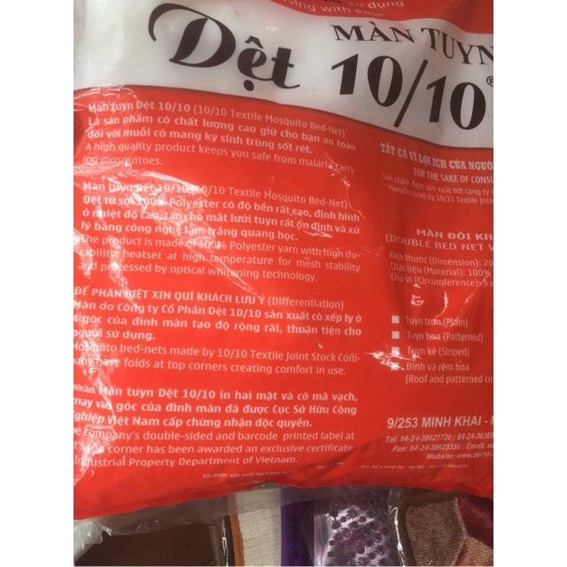 - Sản phẩm chính hãng: Dệt 10/10 - để phân biệt cần lưu ý màn do Công ty Cổ phần Dệt 10/10 sản xuất có xếp ly ở 4 góc của đỉnh màn, tạo độ rộng rãi thuận tiện cho người sử dụng.