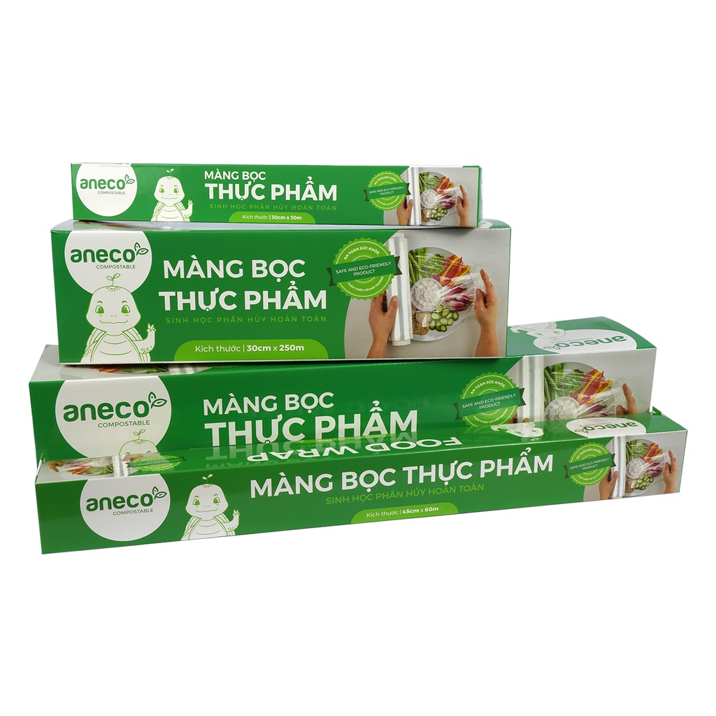 Màng bọc thực phẩm ANECO– 100% phân hủy sinh học: được làm từ nguyên liệu sinh học PBAT, màng bọc thực phẩm AnEco có khả năng phân hủy hoàn toàn trong vòng 6 – 12 tháng thành mùn, nước, CO2 trong điều kiện chôn lấp tự nhiên.