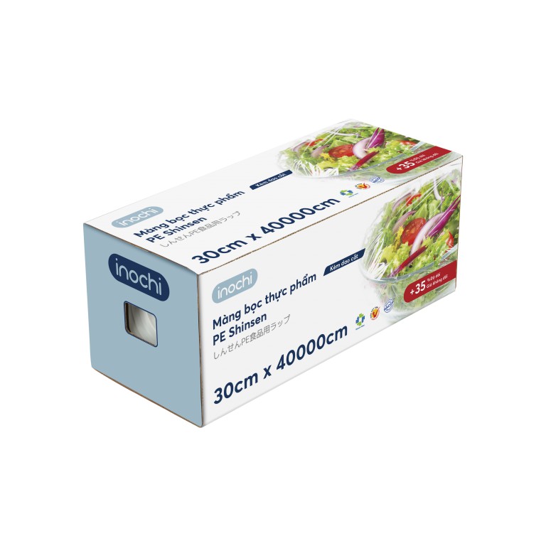 Màng Bọc Thực Phẩm Bảo Quản Đồ Ăn Tươi Mới Sạch Sẽ Có Dao Cắt Tiện Lợi INOCHIđược làm từ nguyên liệu PE an toàn cho sức khỏe người sử dụng, không chứaDEHA và DEHP độc hại.