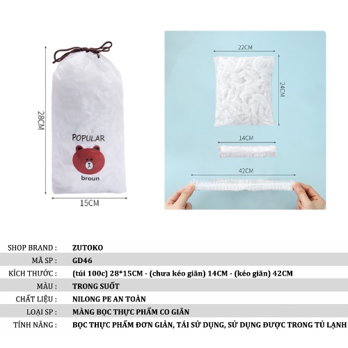 Màng bọc thực phẩm co giãn có chun túi gấu GD46Vấn đề bảo quản thức ăn, bọc thực phẩm để giữ an toàn vệ sinh nhưng thay vì dùng loại nilong bọc cuộn thông thường ZUTOKO xin giới thiệu loại màng bọc thực phẩm siêu tiện lợi sử dụng cực kỳ đơn giản và nhanh chóng có thể tái sử dụng