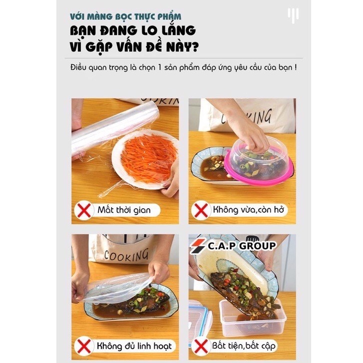 - Thiết kế đặc biệt thông minh, có bo chun ở viền co giãn thoải mái phù hợp với nhiều loại kich thước như: hộp, đĩa, bát,.. đựng thực phẩm.