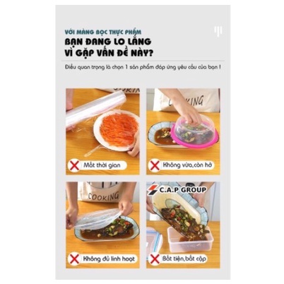 - Thiết kế đặc biệt thông minh, có bo chun ở viền co giãn thoải mái phù hợp với nhiều loại kich thước như: hộp, đĩa, bát,.. đựng thực phẩm.