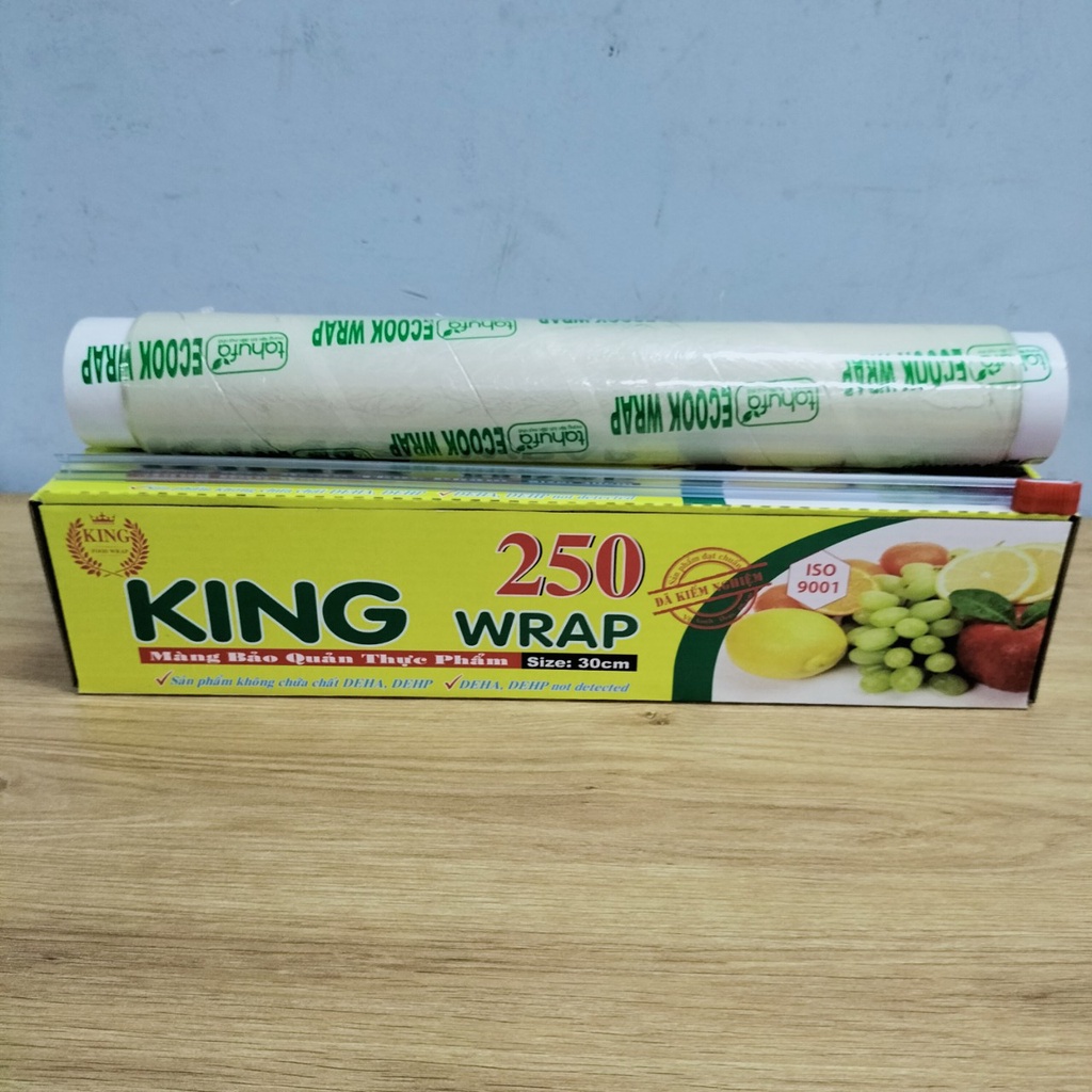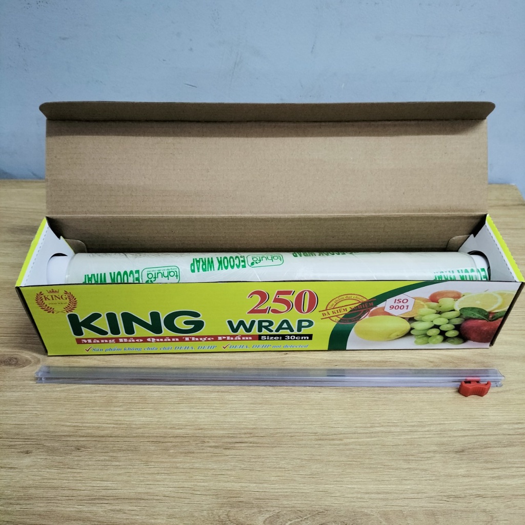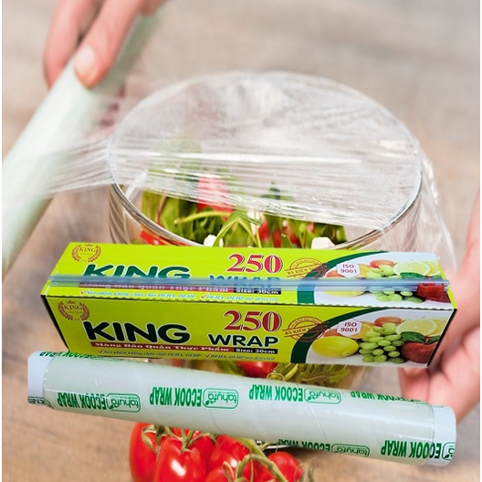 Màng Bọc Thực Phẩm King Wrap K250 ( 30cmx150Y )Màng Bọc Thực Phẩm King Wrap K250 ( 30cmx150Y ) được sản xuất từ nhựa PVC không lẫn tạp chất, hóa chất độc hại, đảm bảo an toàn cho sức khỏe người sử dụng. Sản phẩm có độ đàn hồi tốt, khả năng chịu nhiệt cao từ -60 độ C đến 130 độ C, biên độ nhiệt lớn sẽ giúp thực phẩm luôn được bảo quản khi đặt trong tủ lạnh hay cho vào lò vi sóng.Sản phẩm nhỏ gọn, tiện dụngMàng bọc không màu, tạo điều kiện cho việc quan sát thực phẩm bên trong thuận tiện. Sản phẩm có kích thước nhỏ gọn, chiều rộng 30cm, dễ dàng sử dụng và phù hợp với kích thước của phần lớn bát, đĩa thường được sử dụng trong gia đình.