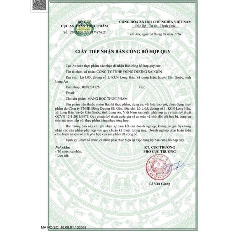 - Sản phẩm có chứng nhận của Cục An Toàn Thực Phẩm - Bộ Y Tế