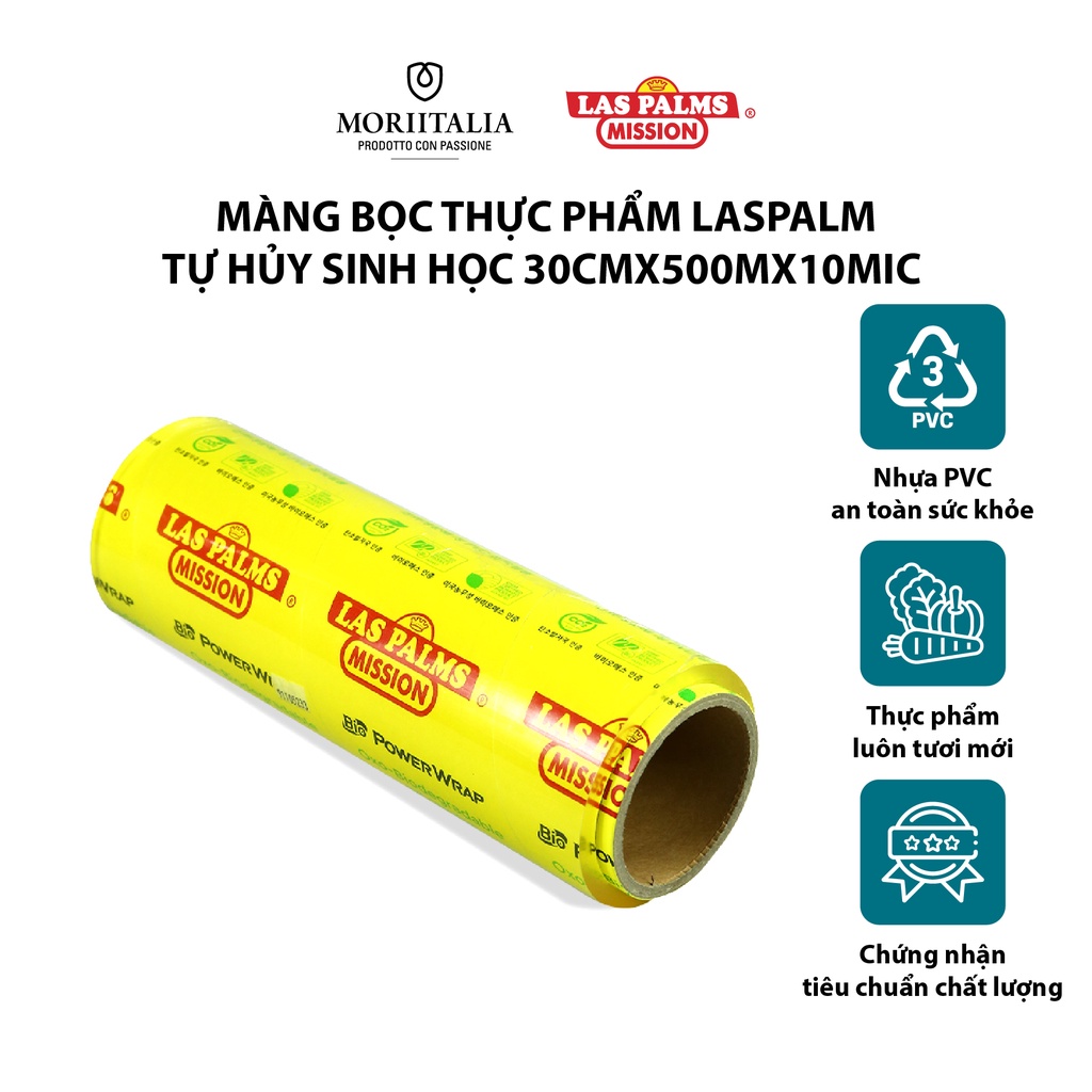 Màng bọc Thực Phẩm Laspalm Hàn Quốc tự hủy sinh học Moriitalia 30cmx500mx10mic - MBTP00000111Las Palms là thương hiệu màng bọc nổi tiếng khắp mọi nơi trên thế giới, được dùng trong các nhà hàng khách sạn cao cấp. Sản phẩm được sản xuất theo tiêu chuẩn quốc tế mang lại an toàn sức khỏe cho người tiêu dùng. Màng bọc thực phẩm Las Palm dẻo và dai hơn so với các loại màng bọc khác cùng ngành.