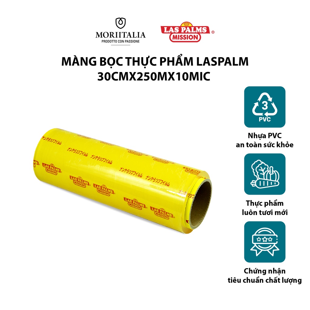 Màng bọc Thực Phẩm Lasplam chính hãng Moriitalia 30cmx250mx10mic - MBTP00000038Las Palms là thương hiệu màng bọc nổi tiếng khắp mọi nơi trên thế giới, được dùng trong các nhà hàng khách sạn cao cấp. Sản phẩm được sản xuất theo tiêu chuẩn quốc tế mang lại an toàn sức khỏe cho người tiêu dùng. Màng bọc thực phẩm Las Palm dẻo và dai hơn so với các loại màng bọc khác cùng ngành.
