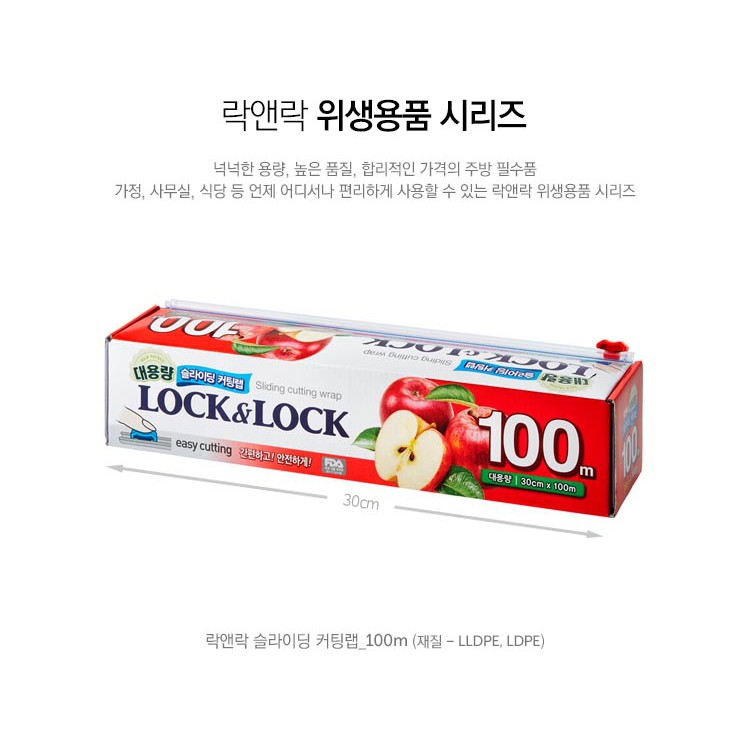 - Màng bọc thực phẩm Lock&Lock LWP804 30cm x 100m được làm từ chất liệu nhựa tổng hợp đã được biến tính kỹ, không gây độc hại cho thực phẩm. Lớp màng phủ bên ngoài dẻo dai, bám dính tốt giúp thực phẩm, trái cây được tươi ngon, bóng và đẹp, không bay mùi khi để trong tủ lạnh, tránh nhiễm khuẩn.