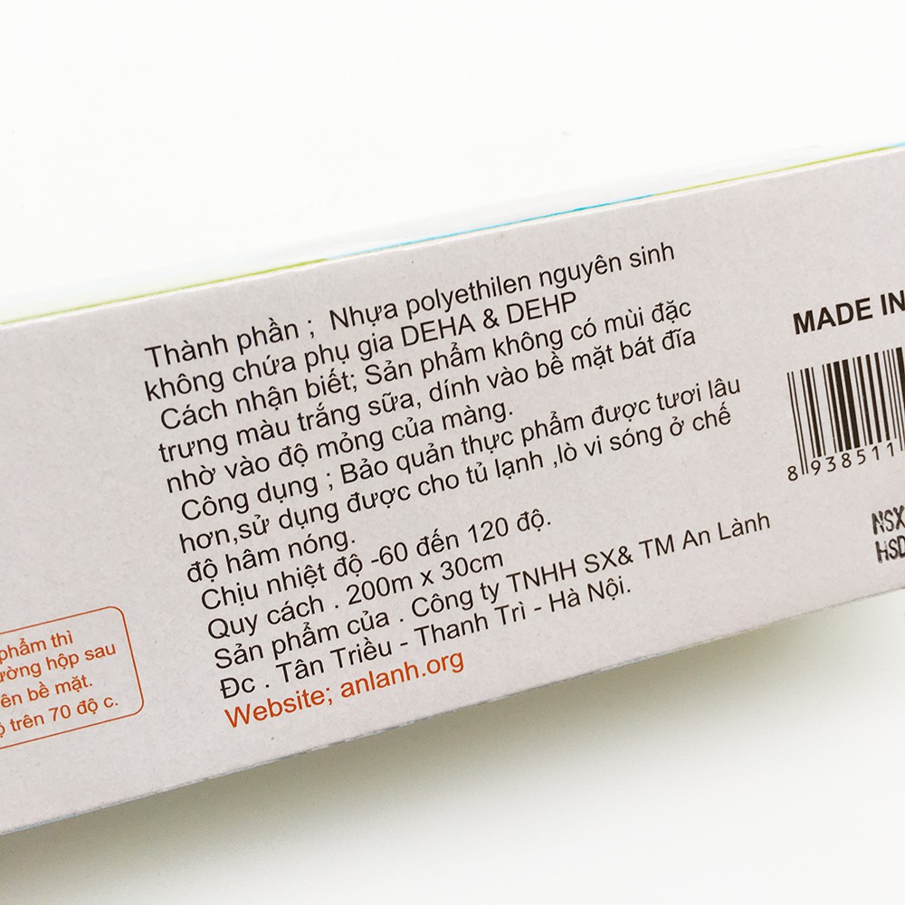 Xuất xứ: Trung QuốcMàng bọc thực phẩm PE PVC An Lành kích thước 30cm x 200m dùng được trong lò vi sóng