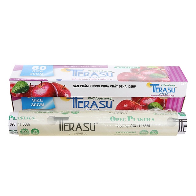 Xuất xứ hàng hóa: Thái LanMàng Bọc Thực Phẩm PVC Terasu 9 Mic x 300 mm x 60M - Màng bọc thực phẩm PVC Terasu tự hủy sinh học ngăn mùi hiệu quả, giúp việc bảo quản đồ ăn trong tủ lạnh trở nên thuận tiện, đảm bảo vệ sinh hơn