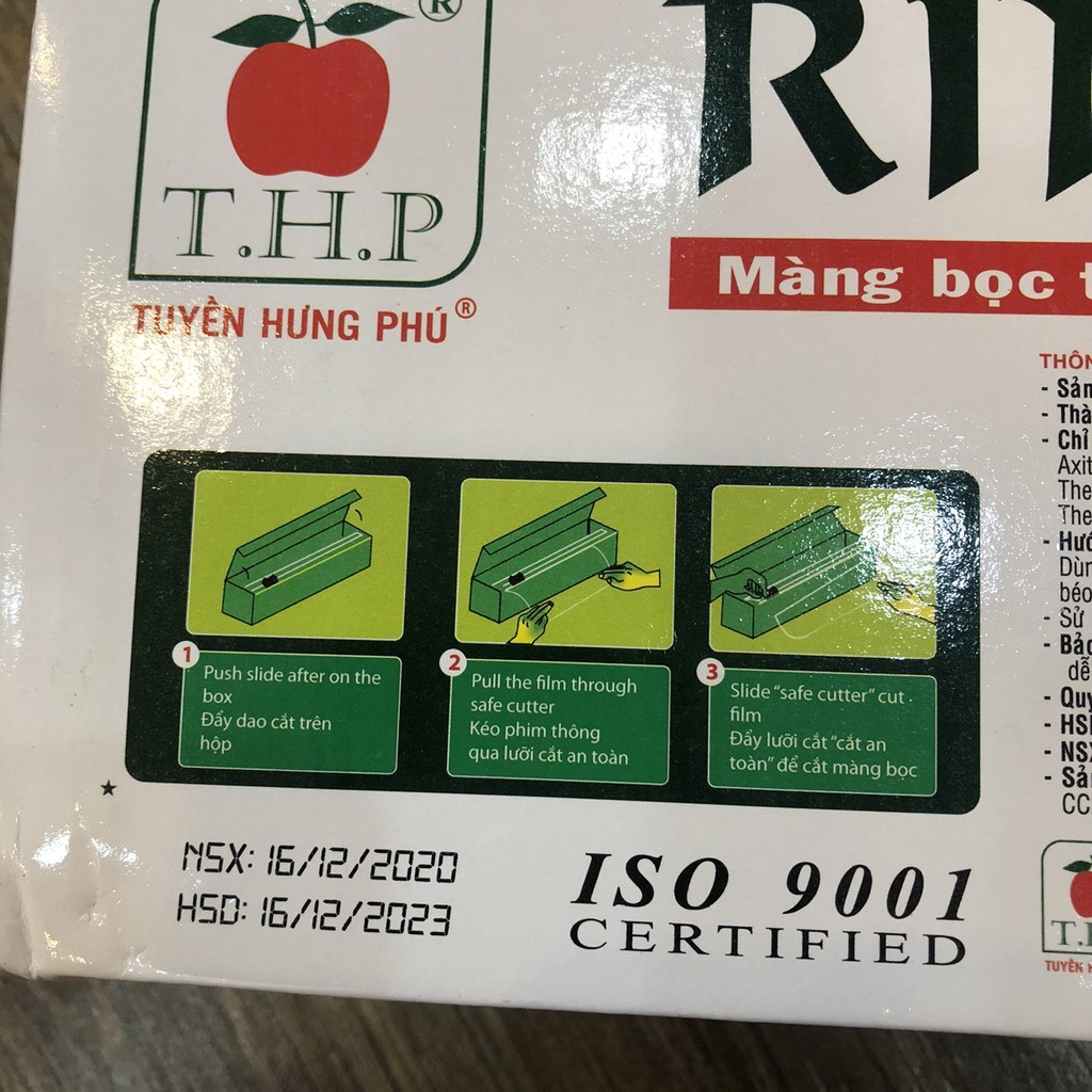 Mỗi cuộn màng bọc được đặt trong một vỏ hộp giấy, có logo trái TáoMàng bọc được kiểm nghiệm theo tiêu chuẩn ISO 9001Mỗi cuộn màng bọc R400 có kèm theo dao gạt tiện lợi và an toàn cho người sử dụng mỗi cuộn màng đều có thông tin sản phẩm được in rõ trên vỏ hộp giấy
