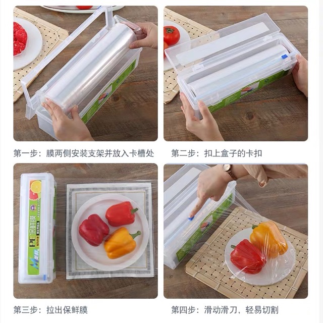 - Dao cắt gắn ở nắp hộp, tiện lợi để cắt màng bọc nhanh và vệ sinh.