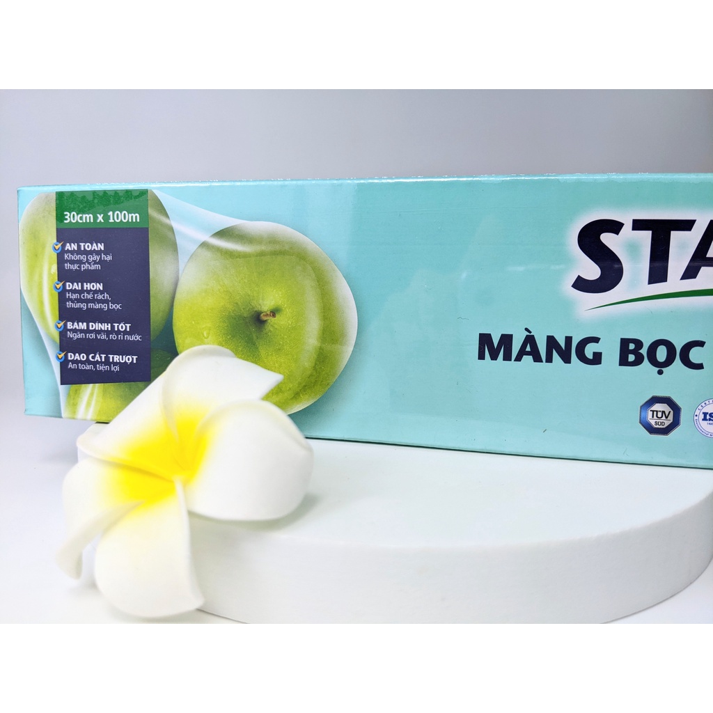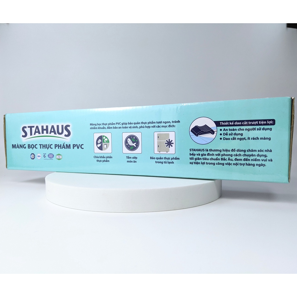 Màng bọc thực phẩm STAHAUS 30cm x 100mCông dụng: thích hợp đóng gói bao bì cho các loại rau củ quả, trái cây, thịt, hải sản…