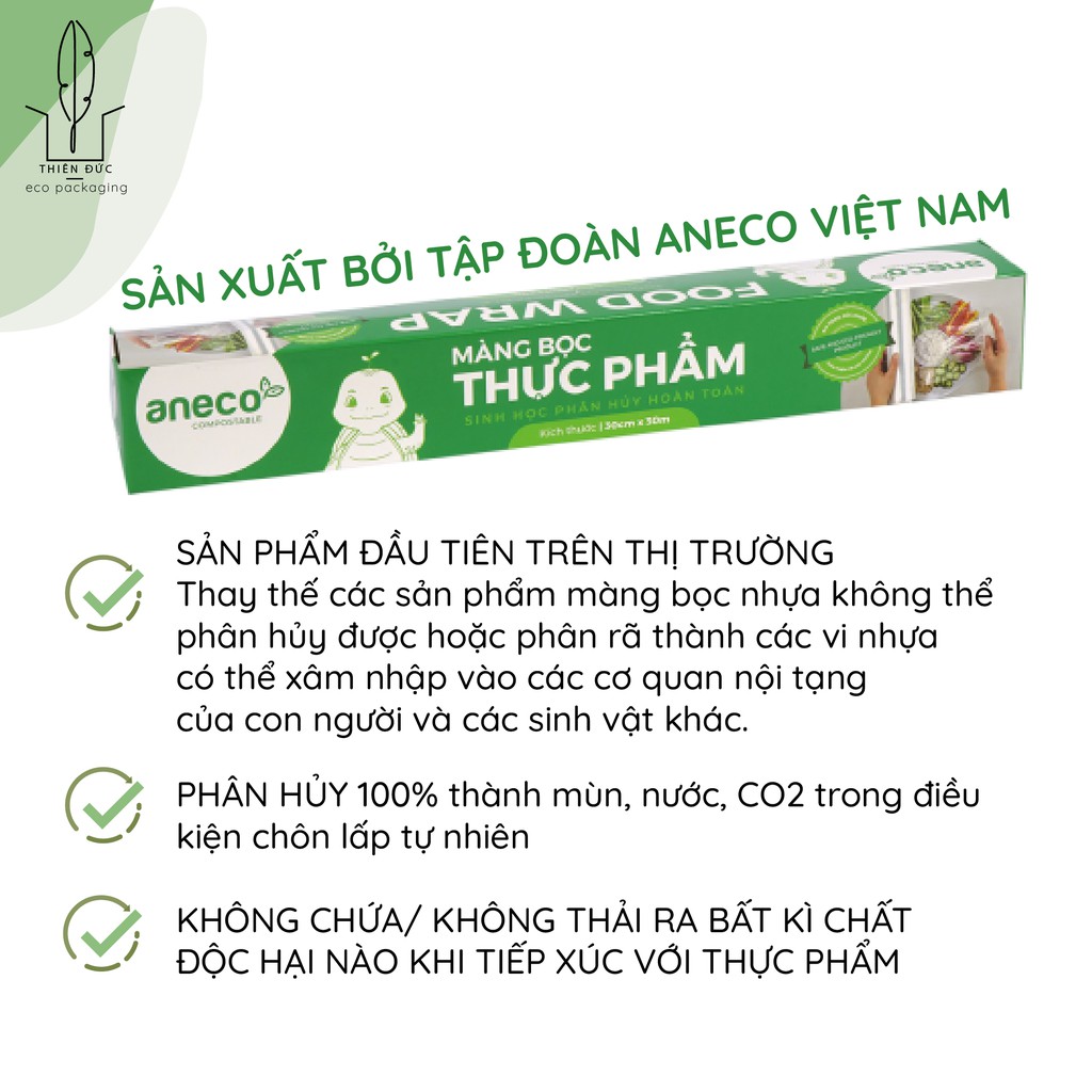 KHI BUỘC PHẢI SỬ DỤNG MÀNG BỌC, HÃY ƯU TIÊN CHỌN MÀNG BỌC THỰC PHẨM ANECO CÓ NGUỒN GỐC TỪ TINH BỘT NGÔ VỚI KHẢ NĂNG PHÂN HỦY 100% THÀNH CO2, NƯỚC, VÀ SINH KHỐI TRONG ĐIỀU KIỆN CHÔN LẤP TỰ NHIÊN, KHÔNG ĐỂ LẠI VI NHỰA, KHÔNG CHỨA/KHÔNG THẢI RA BẤT CỨ CHẤT ĐỘC HẠI NÀO KHI TIẾP XÚC VỚI THỰC PHẨM.