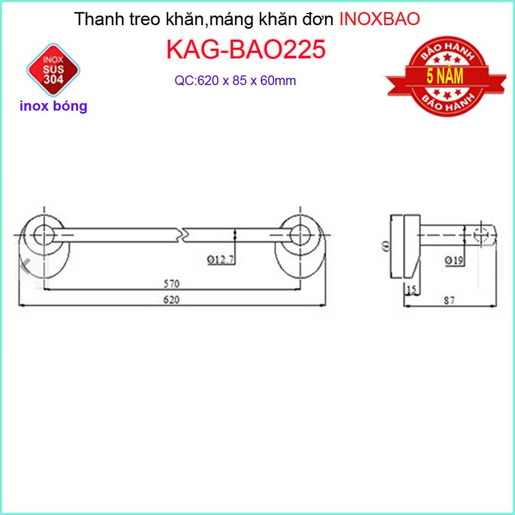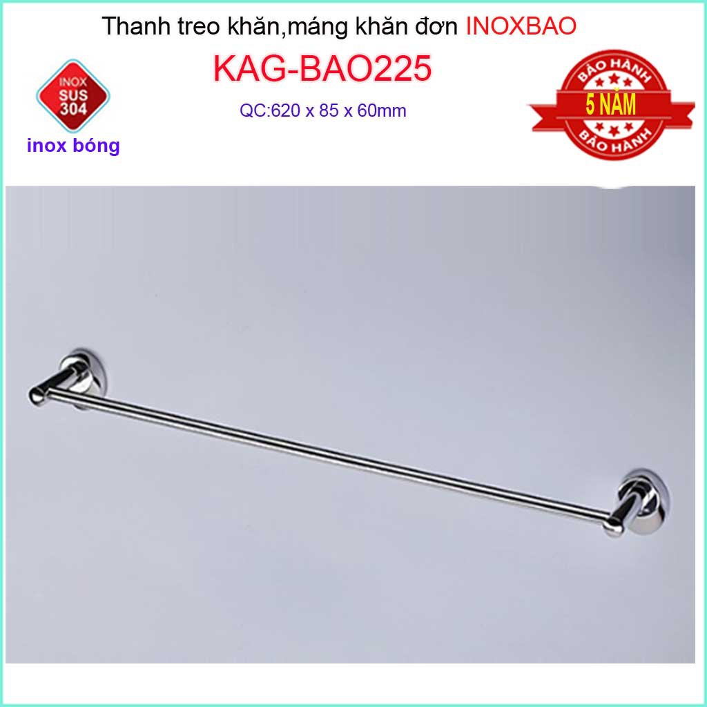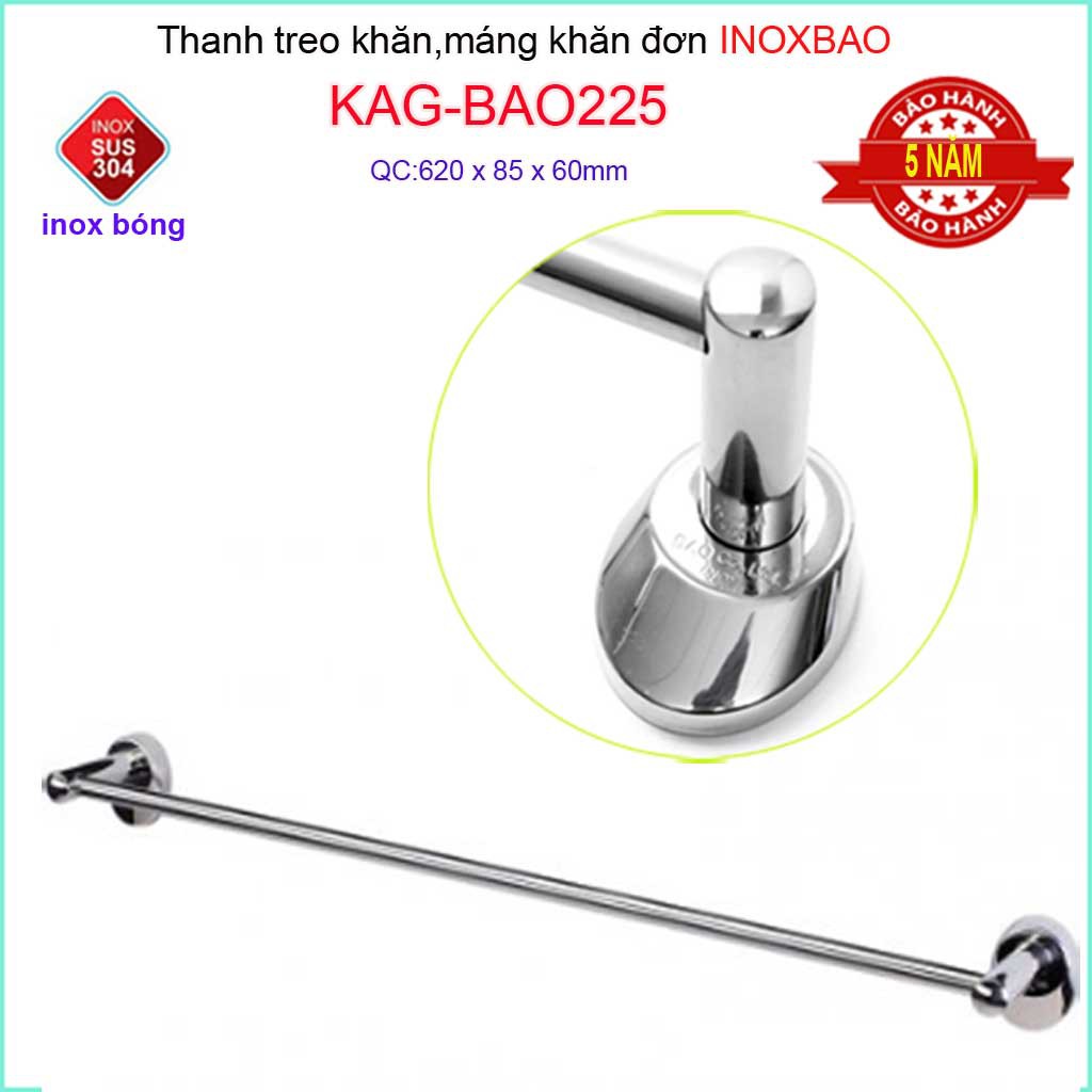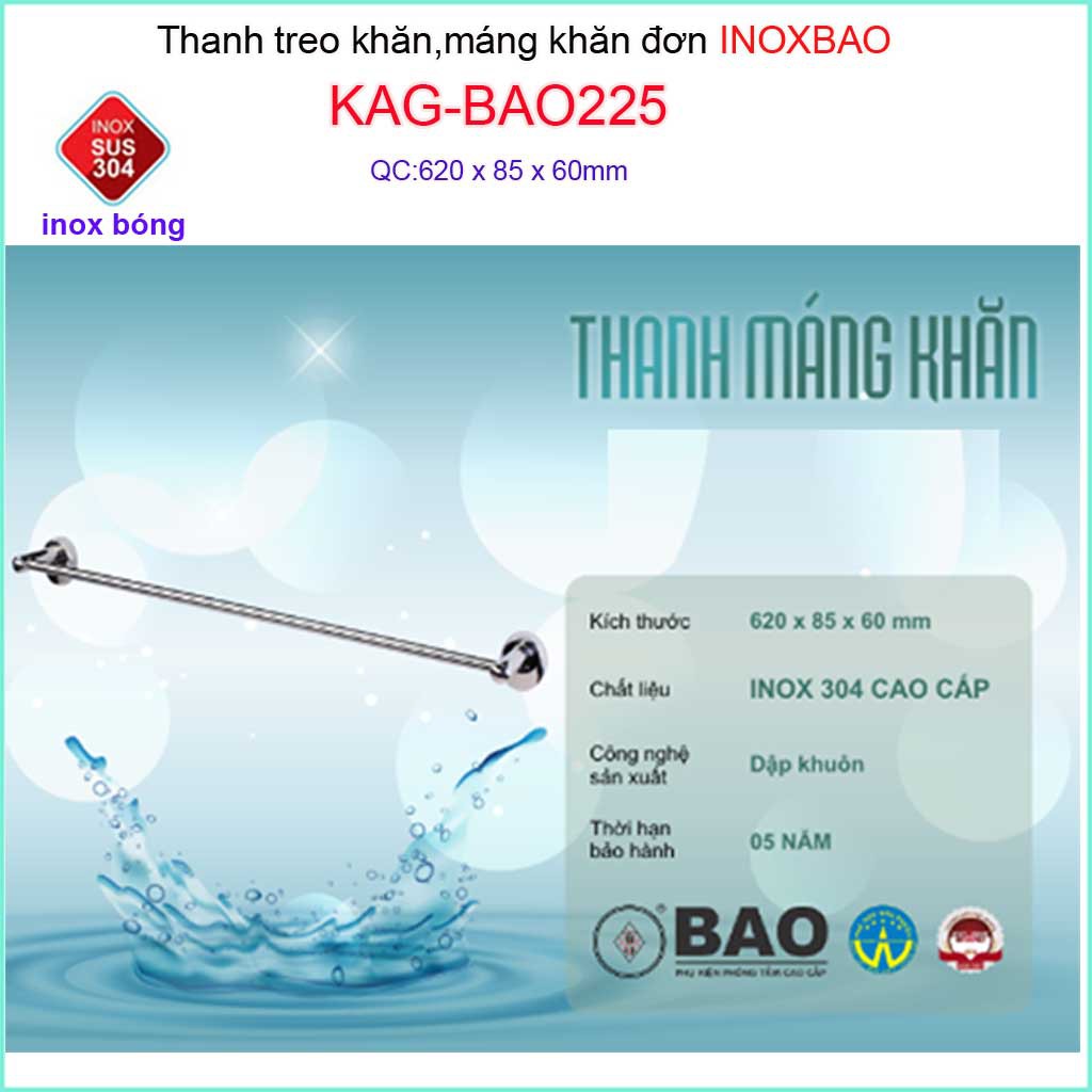 Thanh máng khăn Inox Bảo, thanh treo khăn inox 304, vắt khăn SUS304 KAG-BAO225Thanh máng khăn Inox Bảo, thanh treo khăn inox 304, vắt khăn SUS304 KAG-BAO225 làm bằng inox 304 chất lượng cao cấp với công nghệ hiện đại, thiết kế sắc nét từng góc cạnh, kỹ lưỡng đến từng chi tiết tạo nên 1 sản phẩm hoàn hảo thích hợp cho mọi phong cách phòng tắm.