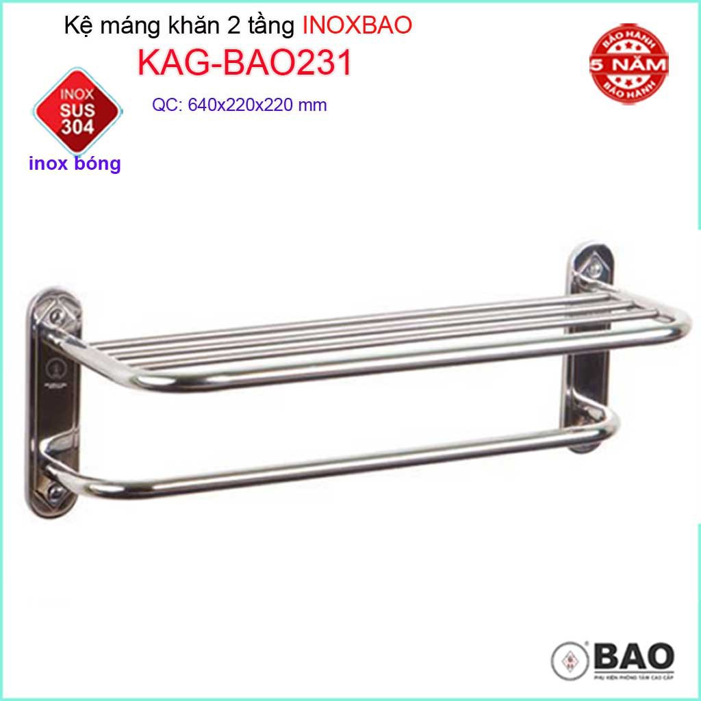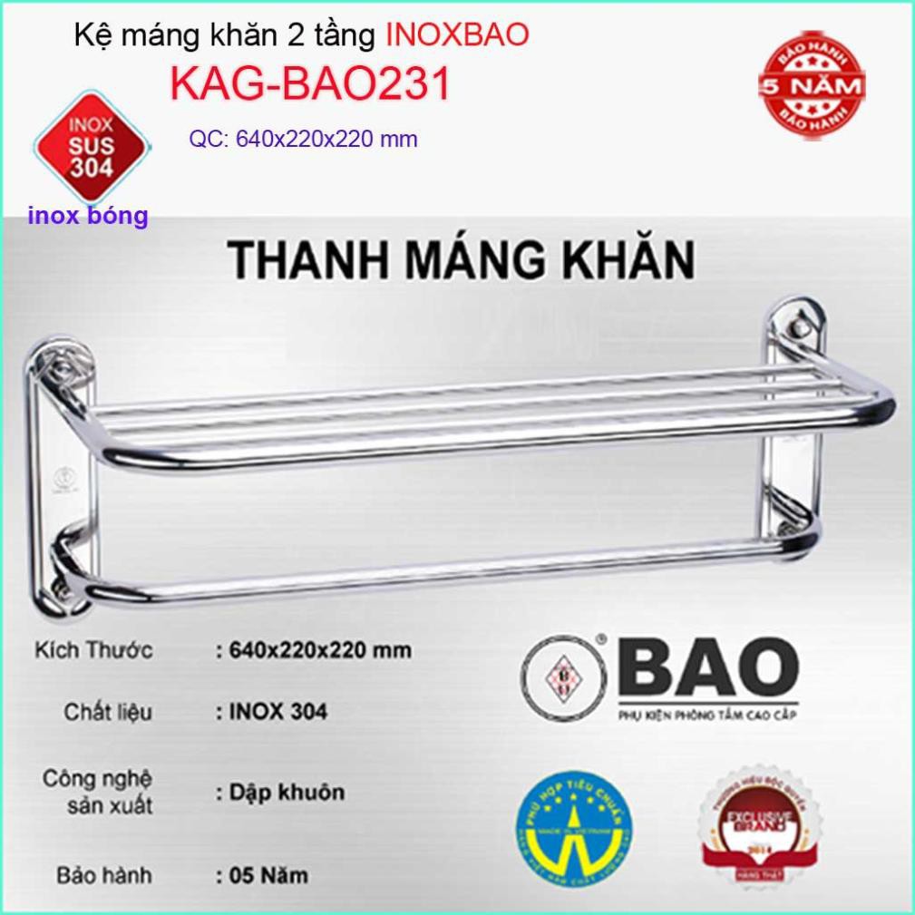 Thanh máng khăn Inox Bảo, thanh treo khăn inox 304, vắt khăn SUS304 KAG-BAO231Thanh máng khăn Inox Bảo, thanh treo khăn inox 304, vắt khăn SUS304 KAG-BAO231 làm bằng inox 304 chất lượng cao cấp với công nghệ hiện đại, thiết kế sắc nét từng góc cạnh, kỹ lưỡng đến từng chi tiết tạo nên 1 sản phẩm hoàn hảo thích hợp cho mọi phong cách phòng tắm.