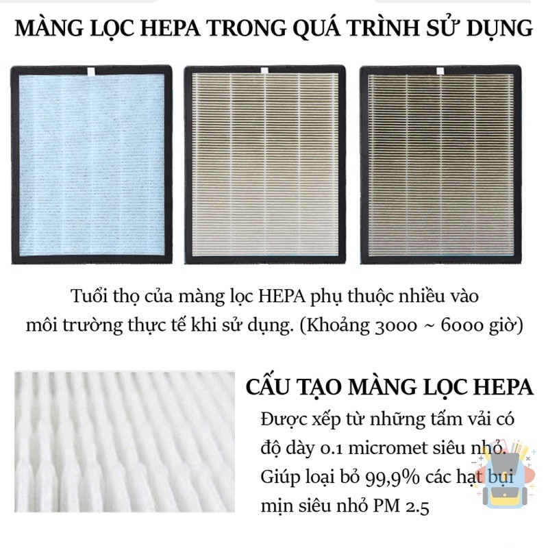 + Màng lọc Hepa loại bỏ đến 90% các tạp chất có trong không khí với kích thước lọc siêu nhỏ đến 0.5 micro.