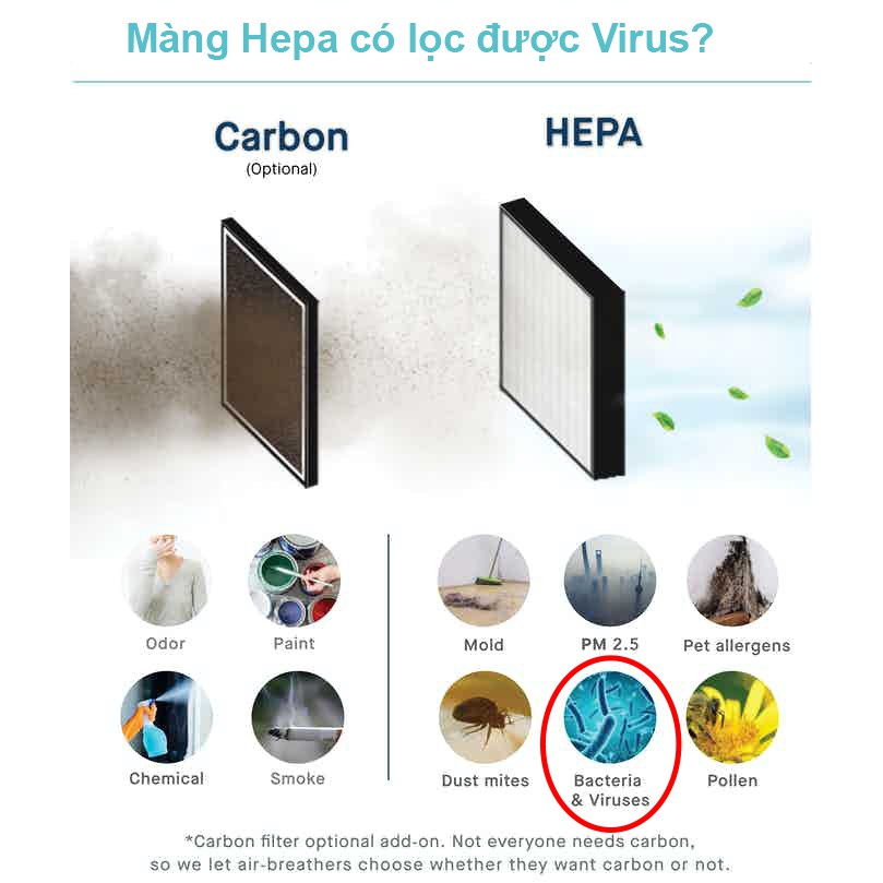 - Trong khi HEPA thu được ô nhiễm dạng hạt (những thứ như PM2.5, PM10 và phấn hoa), các bộ lọc carbon thu được VOC. Đây là những khí độc hại thường đi qua HEPA. Bộ lọc than hoạt tính phản ứng với các khí độc hại này để loại bỏ chúng khỏi không khí.