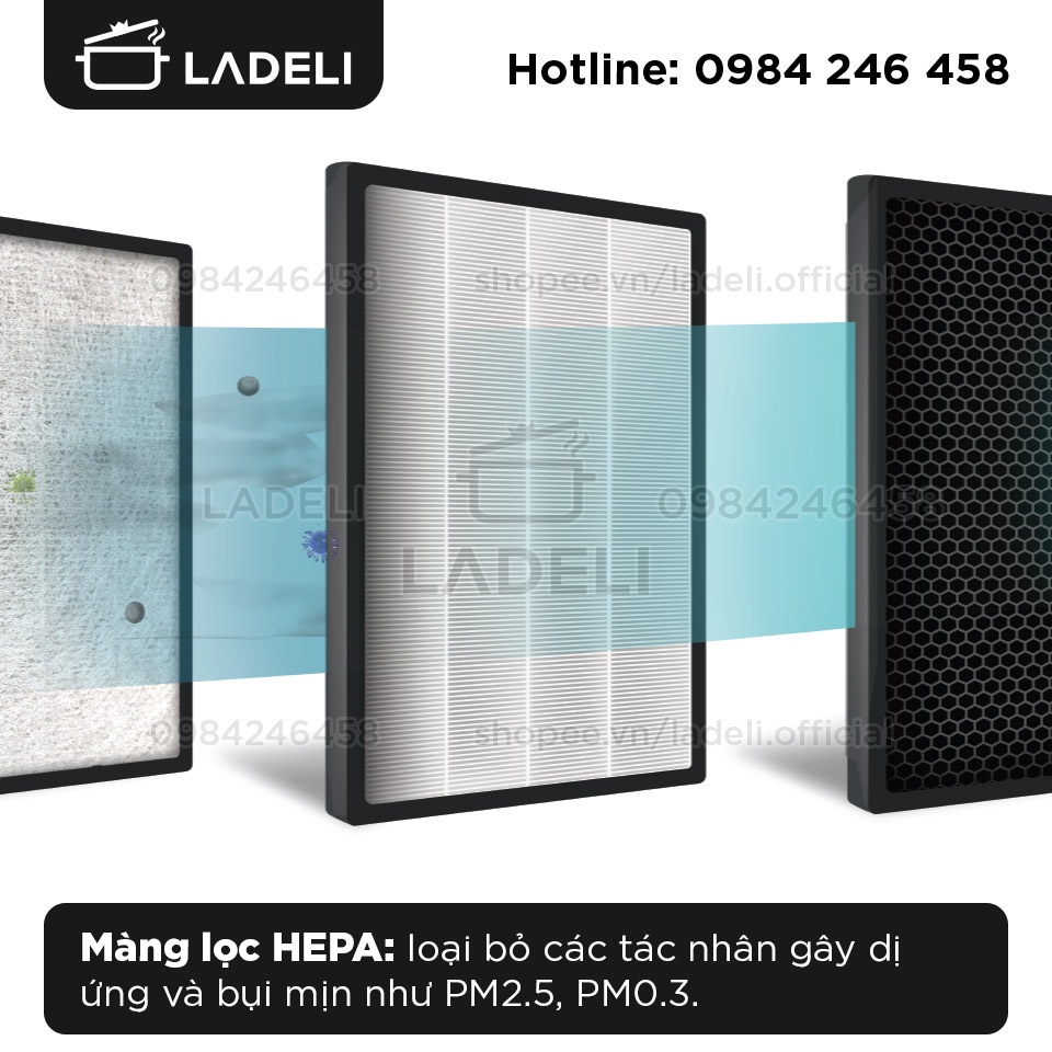 + Màng lọc HEPA: Tinh lọc với hiệu suất cao, loại bỏ các tác nhân gây dị ứng và các loại bụi mịn như PM2.5 và thậm chí nhỏ tới PM0.3.