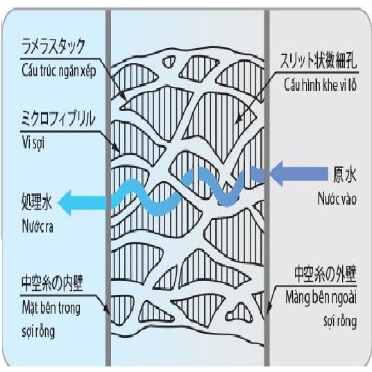 - Hay còn gọi là màng siêu lọc sợi rỗng thẩm thấu, mỗi sợi màng có dạng hình ống, màu trắng, khi lọc cho phép nước đi từ ngoài vào trong lòng ống nhờ áp lực dòng chảy của nước, khi ta bịt một đầu ống lại hoặc uốn ống theo hình chữ (U). - - Dưới áp lực dòng chảy của nước sẽ thấm qua các mao dẫn có kích thước khoảng từ 0,1~0,001micromet (µm).- Không có nước thải lãng phí như RO tiếp kiệm lớn cho người sử dụng.
