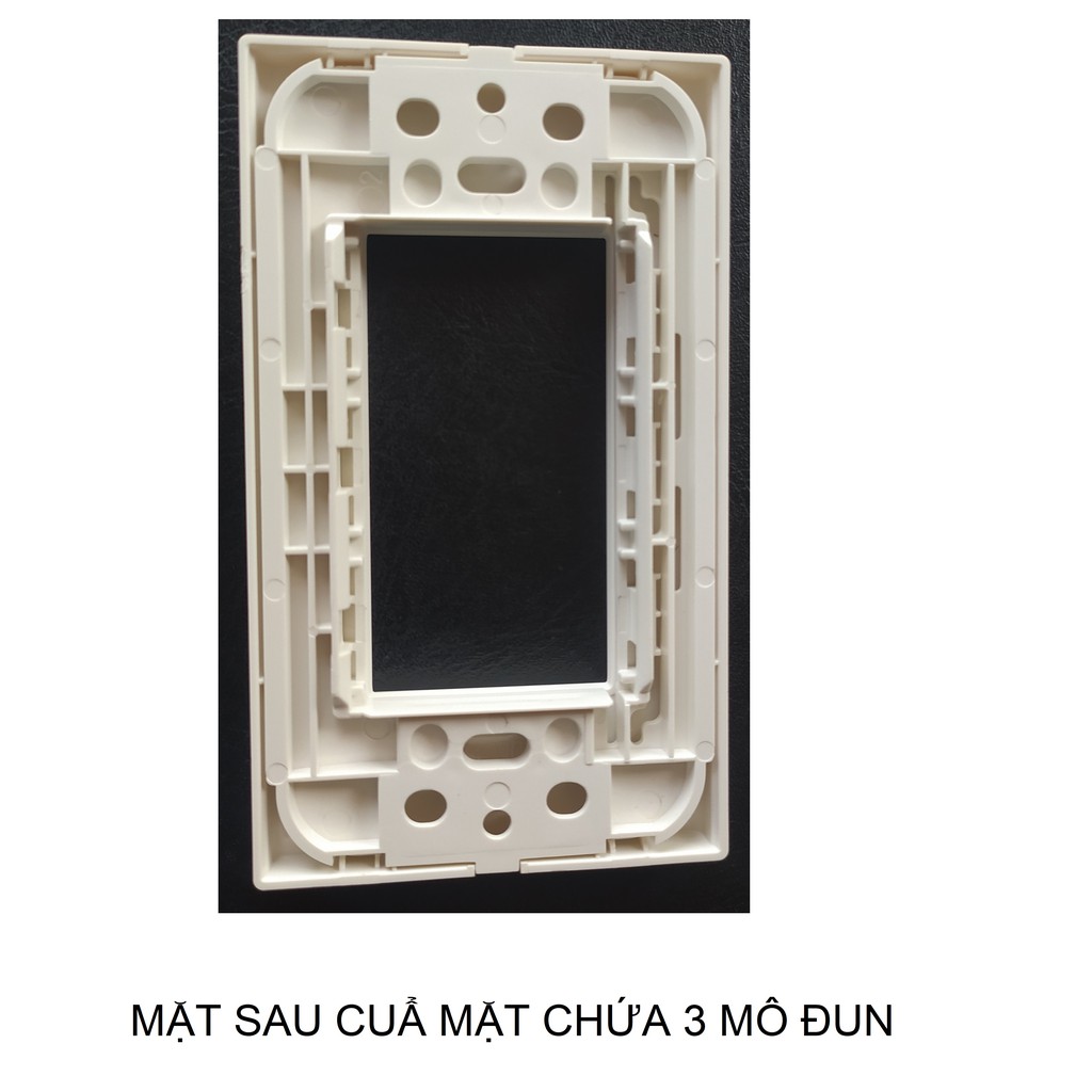 - Mặt 3 MÔ ĐUN : được hình thành bởi 2 phần ( viền, và mặt ). được gắn bởi các chốt, khớp nhựa rất chắc chán và an toàn.Viền màu trắng có đập chữ nổi ( LiOA) , bên trong ghi mã sản phẩm. Mặt ngoài đạp chữ nổi và ghi thương hiệu trên sản phẩm , nó còn có thêm 2 vít cài sẵn trong đó..
