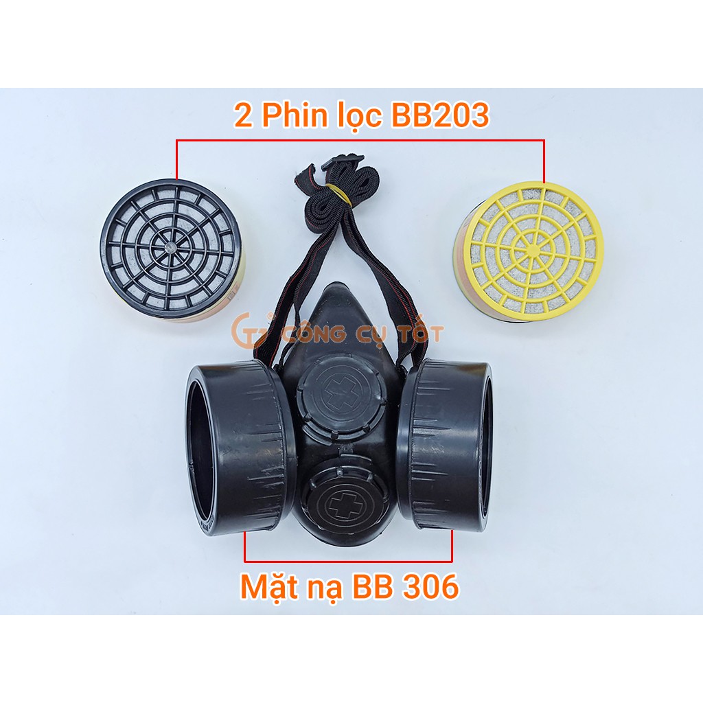 Mặt nạ chống bụi mịn và phòng khí độc công nghiệp gồm: 1 Mặt nạ phòng độc BB 306 và Phin lọc than hoạt tính BB 203. thích hợp sử dụng trong môi trường ô nhiễm độc hại, nhiều bụi như ngành sơn, hàn, xì, ngành vận tải, xây dựng, ngành hóa chất, dung môi, thủ công mỹ nghệ, dệt may, phun thuốc diệt côn trùng, thuốc trừ sâu, phân bón...Gồm 2 loại : 1 lõi và 2 lõi lọc than hoạt tính BB 203