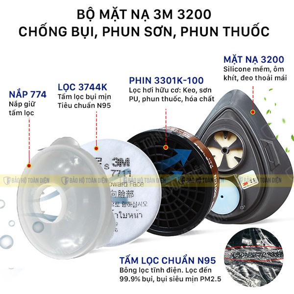 Bộ mặt nạ phòng độc 3M 3200 [trọn bộ 4 món] phun thuốc trừ sâu, phun sơn, lọc bụi, an toàn cho sức khỏe