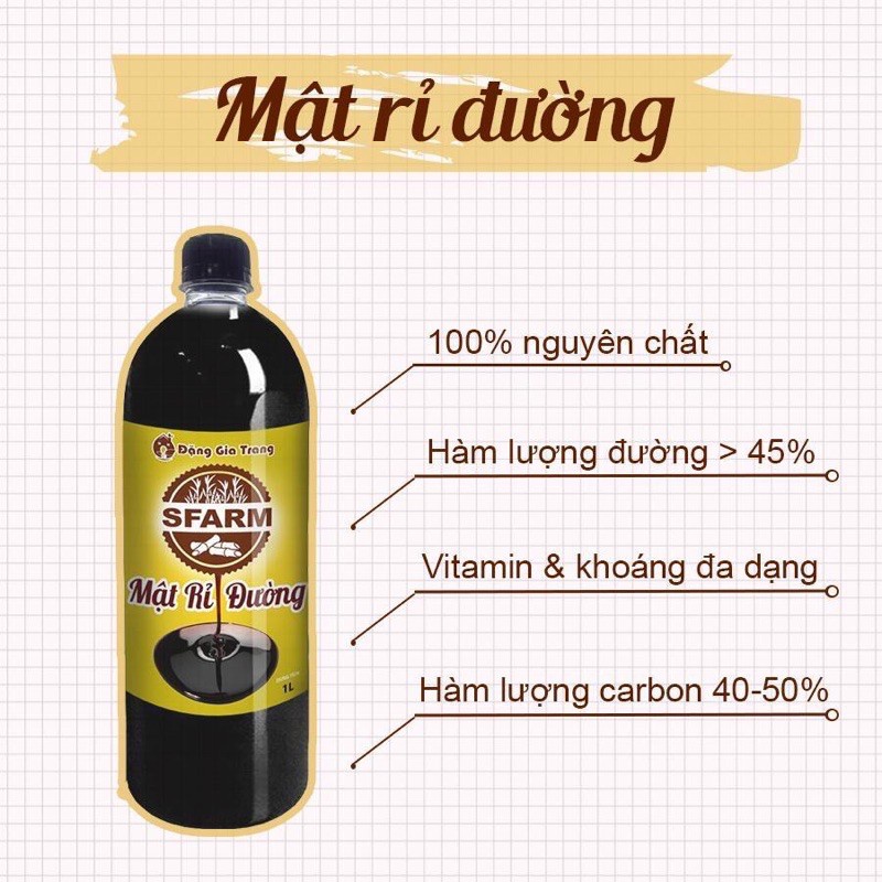 Mật Rỉ Đường (Rỉ Mật Mía) SFARM Nguyên Chất Dùng Ủ Phân, Nuôi Cấy Vi Sinh Cực Tốt Chai 1 Lít✔️ Mật Rỉ Đường hay Rỉ mật đường/mía (tên tiếng anh: Molasses) là dòng phế phụ phẩm trong công nghệ sản xuất đường ăn. Mật rỉ đường là chất đậm đặc lỏng sánh, màu đen và có mùi thơm của đường. Trong mật rỉ đường chứa rất nhiều thành phần hữu cơ, amino acid và nhiều loại gốc đường đơn như Glucose, Fructose và nhiều khoáng vi lượng khác.