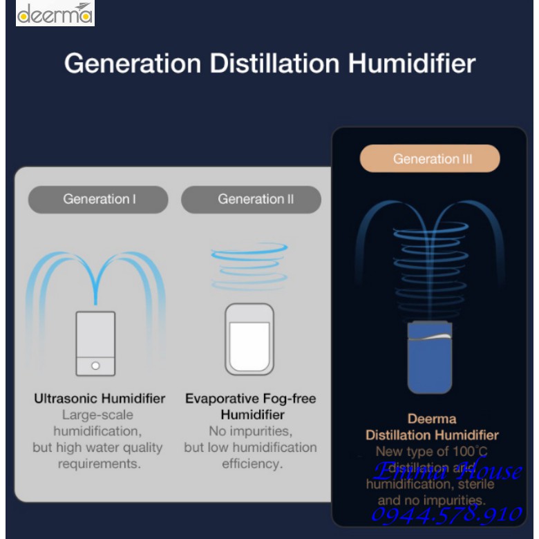 - Máy tạo ẩm phun sương của Deerma được chia ra làm 3 thế hệ: