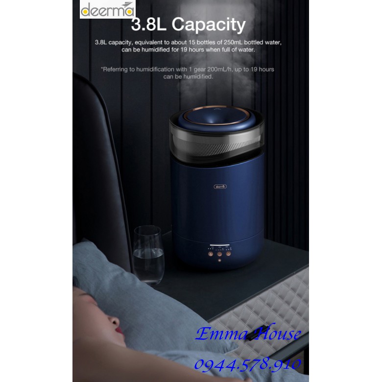 - Dung tích 3.8L: tương đương với khoảng 15 chai nước đóng chai 250mL, có thể tạo ẩm trong 19h khi đầy nước với lưu lượng sương 200ml/h