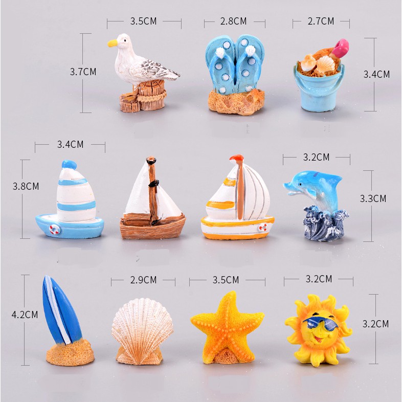 Sản phẩm là các mô hình những vật dụng quen thuộc trên bãi biển như xô đồ chơi cát, vỏ sò, đôi flip-flop, ván lướt....Kích thước: vui lòng xem trên ảnh chung !