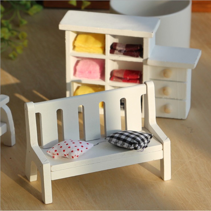 Mẫu mô hình ghế băng sơn trắng + kèm đôi gối dùng trang trí nhà búp bê, tiểu cảnh, terrarium, dựng ngoại cảnh, DIY