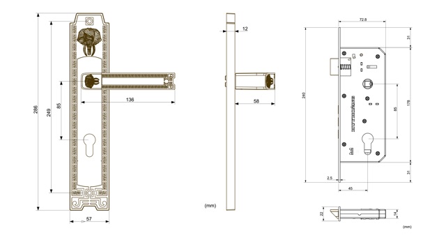 Thân khóa được sản xuất bằng inox 304 với độ dày 1,5mm, then khóa làm bằng đồng vàng (đồng thau) có kết cấu chắc chắn, an toàn. Tất cả chi tiết khác bên trong thân khóa được làm bằng tôn thép mạ Zn theo tiêu chuẩn quốc tế.
