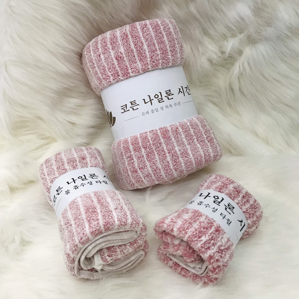 - Combo 3 khăn sợi bông Hàn Quốc được sản xuất theo công nghệ đặc biệt với chất liệu an toàn tự nhiên có công dụng giúp tẩy sạch và loại bỏ mọi bụi bẩn, đồng thời tạo bọt, hút nước tốt mà vẫn mềm mại, thoải mái khi sử dụng.
