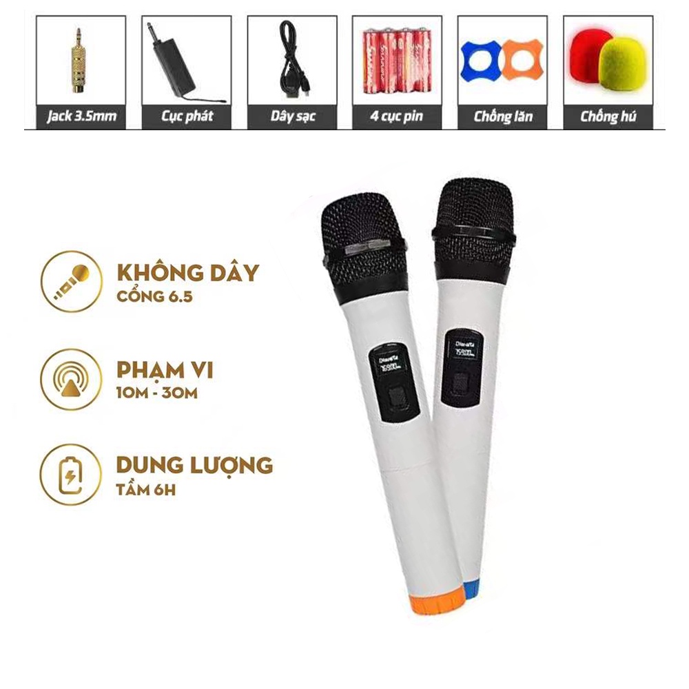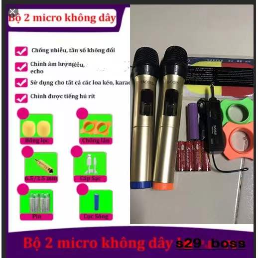✔Trọn bộ gồm có: 2 micro, 1 bộ thu phát tín hiệu, 1 pin 3V7, 4 pin 2A, 1 cáp sạc, 1 đầu cắm chuyển đổi