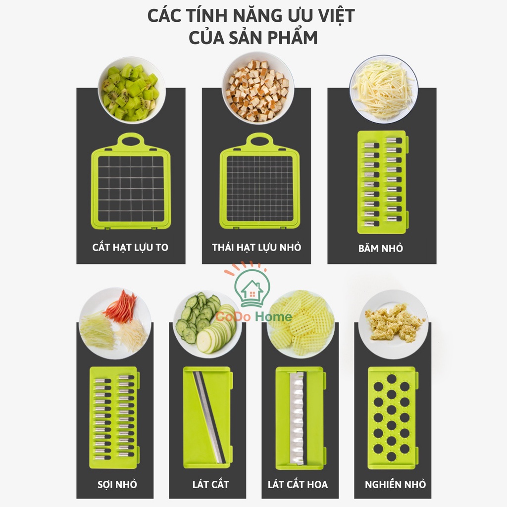 - 1 sản phẩm mà tích hợp 7 chức năng : cắt hạt lựu to, cắt hạt lựu nhỏ, cắt sợi nhỏ, bào củ, cắt lát mỏng, cắt lát hoa, nghiền nhỏ…